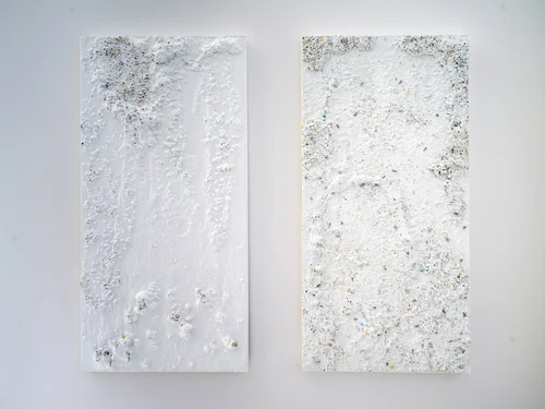 Plaster casts mixed with a variation of hole-punched paper size and weight. The effect creates an outer texture which can result in a fracture in the structure.